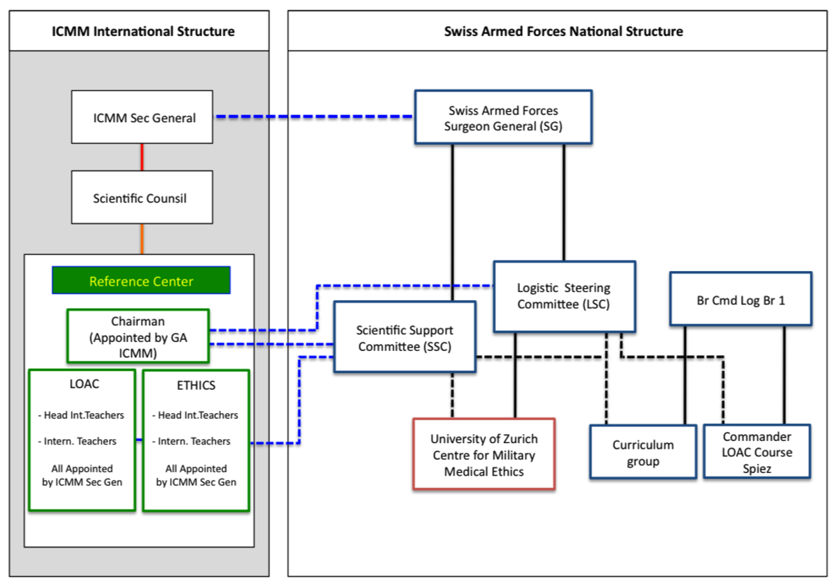 This organisation chart shall give you an idea of how the several actors involved in the ICMM Reference Centre for Education on IHL and Ethics cooperate with and report to each other.